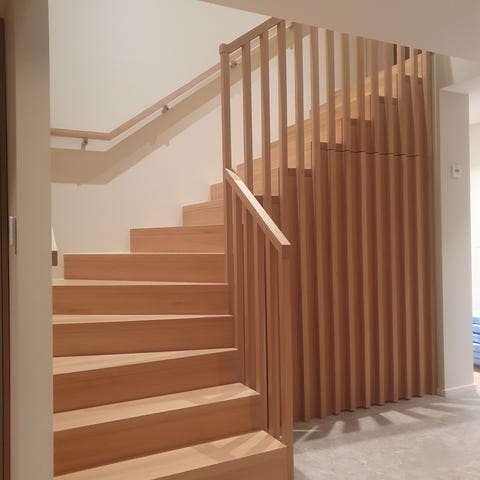 Tretrapp med rekkverk i mørk farge. L trapp.