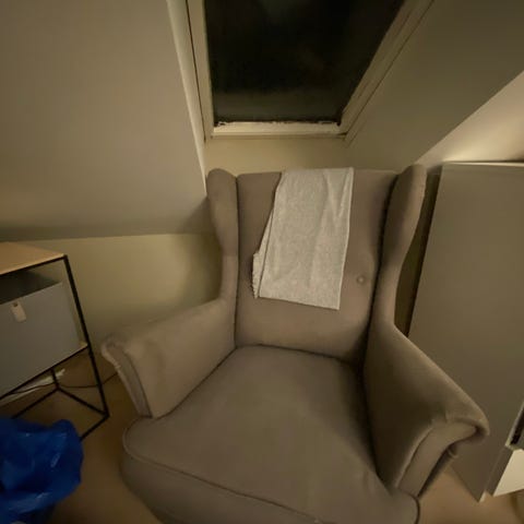 Lenestol og fotskammel selges samlet på grunn av plassmangel.