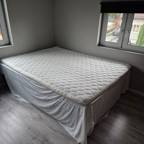Overmadrass følger med (trenger vask), beskyttelsetrekk følger ikke med.