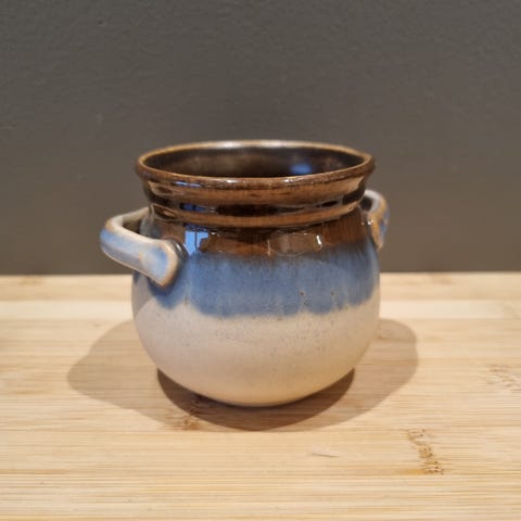6 små blå keramiske bladformede krukker. Dekorert med blomster og gullfarget dekor.