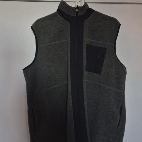 Pent brukt og lett vattert vest med hette og lommer.