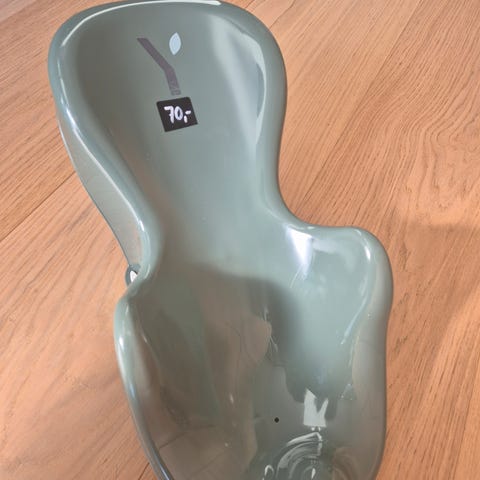 Karibu sammenleggbar babybadekar i hvitt med beige detaljer. Badekaret er laget av plastmateriale og kan foldes sammen. Krok for oppheng når det ikke er i bruk. Kun brukt en gang hos bestemor, stått en stund og støvet ned.