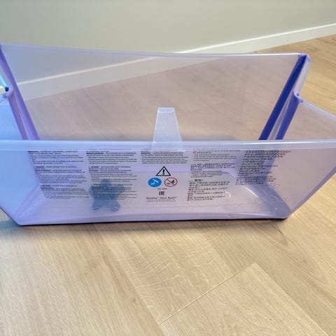 Stokke flexi bath. Brukt til 3 barn, men ingen synlig slitasje eller feil utover at hempen på toppen er knukket. Dette har ingen betydning for bruk og en kan holde den sammen med en strikk eller noe annet.