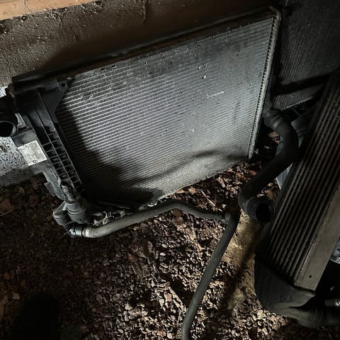 BMW radiator og intercooler i brukt tilstand. Komponentene inkluderer radiator og intercooler med tilhørende slanger. Egnet for kjøretøy som krever disse deler for kjøling og luftinntak.