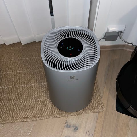 2stk Blueair Classic 480i luftrenser i hvit farge. Enheten har en sylinderformet design med perforert topp og stoffkledd nedre del. Egnet for å rense luften i rom, med fokus på effektiv filtrering.