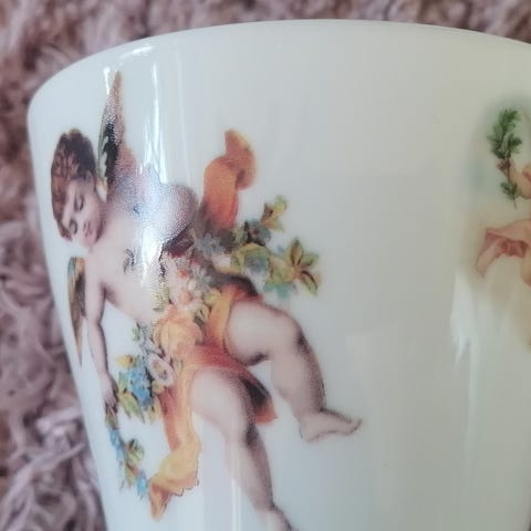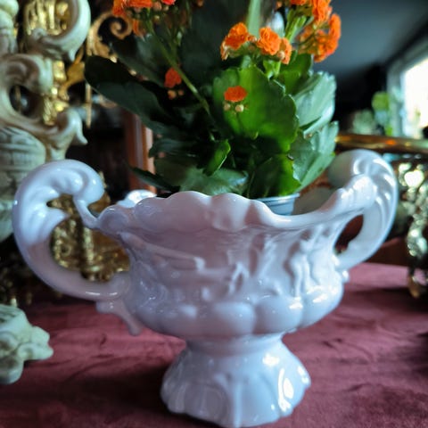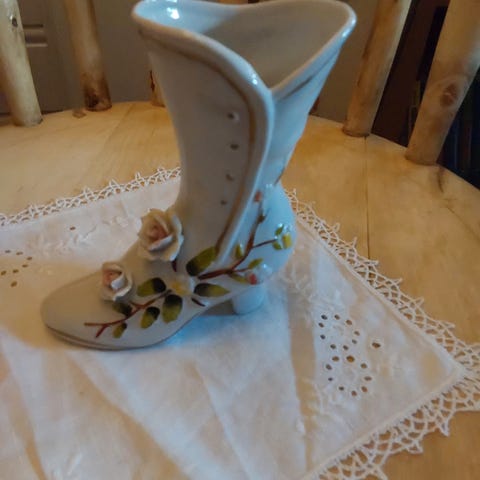 Porselensko i rokokkostil. Skoen er svakt-grå/sølvfarget med rødt og gull i dekoren. Ingen skader.