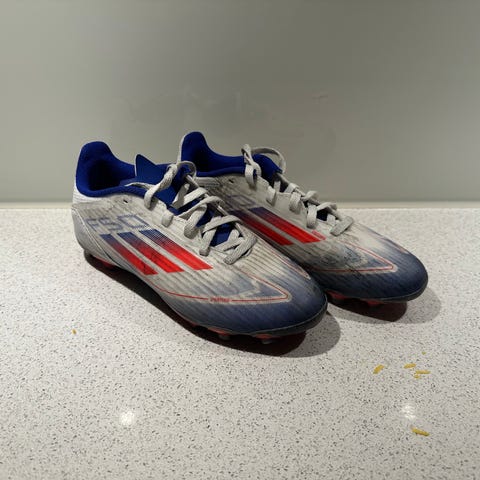 Adidas fotballsko i størrelse 38, med hvit overdel og blå detaljer. Skoene har knotter for bruk på kunstgress eller gressbaner. Laget for å gi grep og støtte under fotballspill.