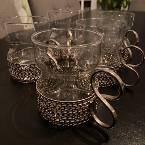 Iittala glasskrus med metallholder. Glassene er laget av klart glass og har en dekorativ metallholder rundt bunnen og håndtaket. Passer til servering av varme drikker.samlett