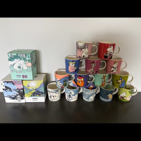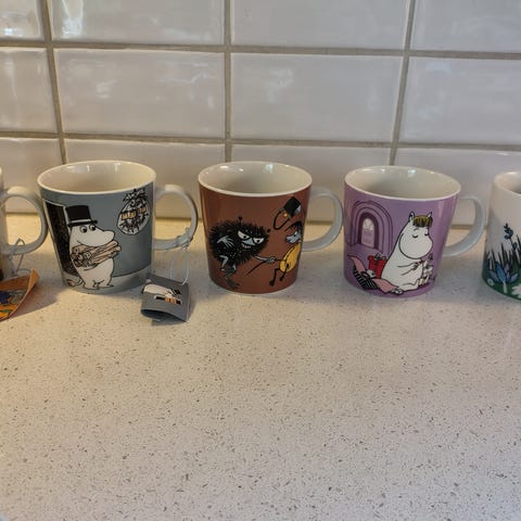 Lite bruke Arabia Mummi krus med ulike karakterer fra Mummidalen. De har mest stått som pynt i skapet. Krusene er som sakt laget av keramisk materiale og har forskjellige farger og motiver.