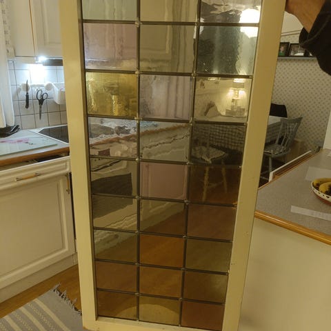 Bly vindu med farget glass i ulike farger, montert i en ramme av tre. mål 50 x 160cm. Farget blyvindu. En er knust og en er hel.