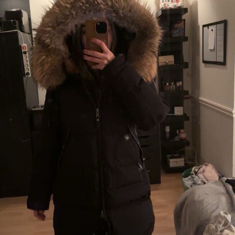 Cedrico Monet. Str L, normal i størrelsen. Jakken har fyll av gåsedun og fjær. Pelsen rundt hetten er vaskebjørn. Halskanten er kaninpels.
