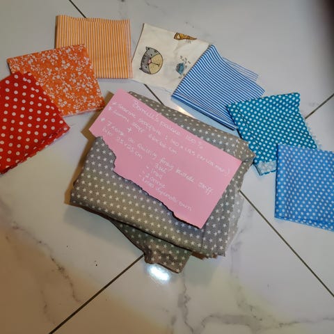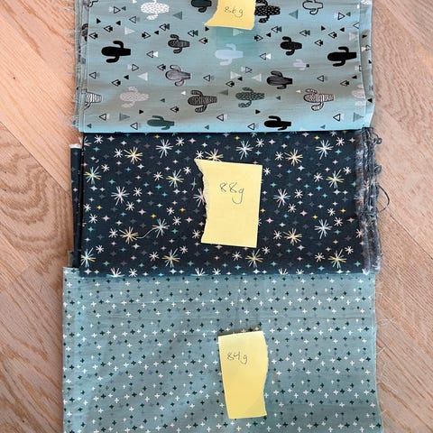 Pakke med ulike bomullstoffer i forskjellige mønstre og farger. Stoffer til lappeteknikk/quilting selges etter min mor