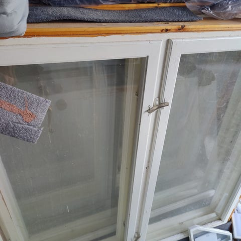 Hvite innerdører med glassfelt og ventilasjonshull i bunnen. Dørene har en enkel design med ramme og glassplate, samt ventilasjonshull for luftgjennomstrømning. Egnet for bruk innendørs.