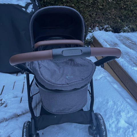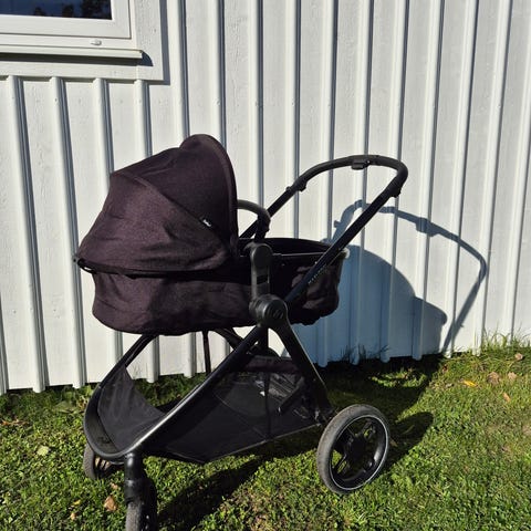 Maxi-Cosi barnevogn med sete og liggedel i grønn farge. Vognen er brukt til ett bar. Barnevognen har justerbart sete med sele og solskjerm, samt en liggedel for nyfødte. Håndtak med brunt trekk og fire hjul for god stabilitet. Noe slitasje på stoffet under setet er synlig (se bilder), samt noen riper i den sorte lakken.