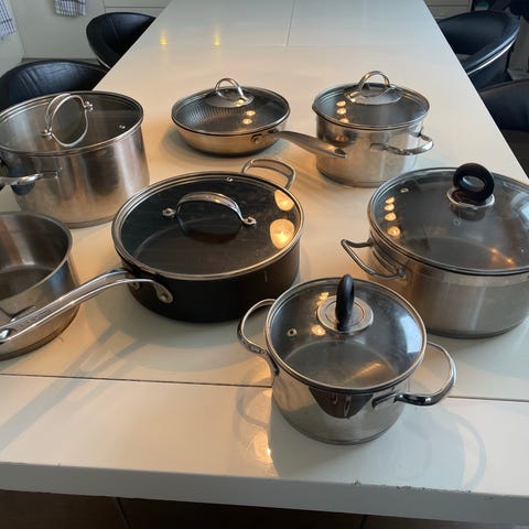 Tefal grytesett bestående av flere gryter med glasslokk. Grytene har non-stick belegg og indikator for riktig temperatur. Settet viser noe bruksslitasje på bunnen av grytene, og det ene lokket mangler en metallring. Helt supre kjeler som alle fungerer helt fint fortsatt.