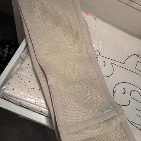 Pent brukt sprinkelsengbeskytter fra Minitude selges, da vi ikke lenger trenger den. Følger også med oppbevaringspose.
