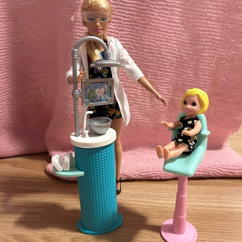 Barbie tannlegelekesett med to dukker og tilbehør for tannbehandling. Settet inkluderer en tannlegestol, en liten pasientdukke og en voksendukke, samt utstyr som tannlegebelysning og vask. Egnet for rollelek og utvikling av fantasi.
