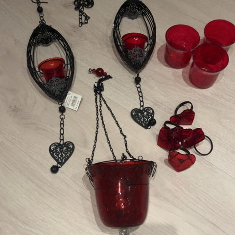 Høyde rett under 26cm. Selges samlet. Kan sendes mot at kjøper betaler frakt. Lysholderene til nissemor ser litt skeive ut, men de er slik fra produksjonen. Kjøper man flere av mine ting kan de sendes samlet.