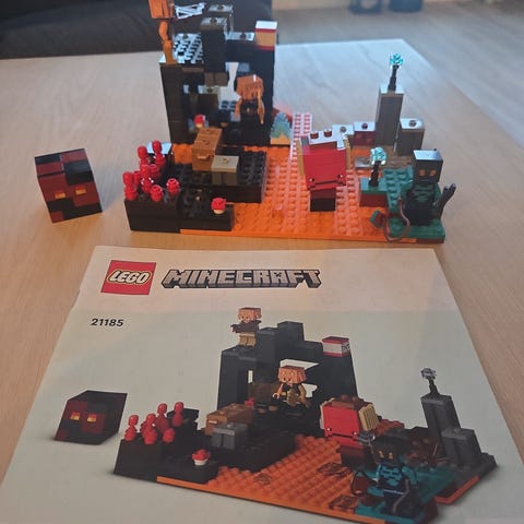 LEGO Minecraft byggesett med ulike byggeklosser i flere farger, inkludert grå og oransje. Settet inneholder deler som kan brukes til å bygge strukturer og figurer inspirert av Minecraft-verdenen.