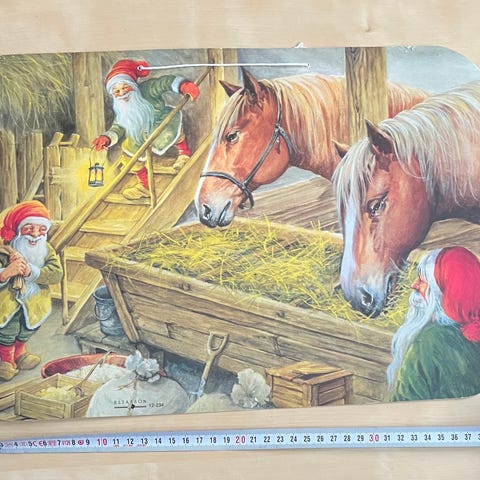 Bilde av Nisser illustrert av den svenske kunstneren Jenny Nyström fra 1894. To nisser som spisser grøt i en låve/nissene spiser grøt.