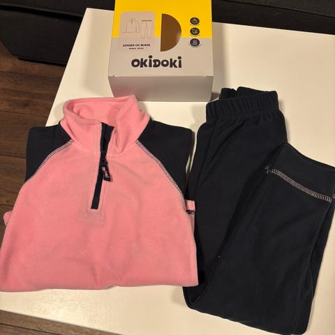 Selger et helt nytt Okidok fleecesett (bukse og genser med glidelås).