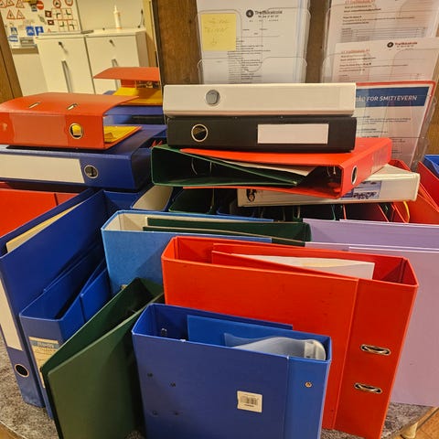 3 store permer, ganske mange hefter og mindre permer. Har ikke tellingen men sikkert 50-60 stk tilsammen. De fleste er i ganske god stand, noen med litt bøy/knekk og klistermerkerester er synlig på den ene permen. Alt i alt ser det ganske ok ut