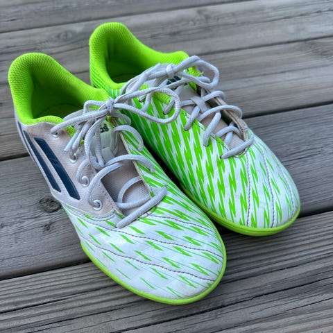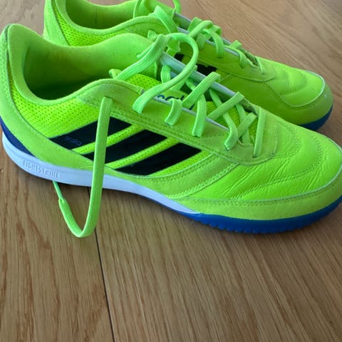 Adidas unisex innendørs sko i størrelse 37 1/3. Skoene er hvite med røde og blå detaljer, og har en gummisåle tilpasset innendørs bruk. Materialet består av syntetiske fibre og gummi. Skoene er egnet for innendørs sport og aktiviteter.