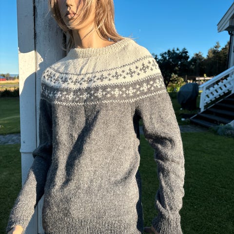 Hjemmestrikket genser i størrelse M for kvinner, laget av alpakkaull. Genseren har en grå farge og er egnet for bruk som varm og komfortabel overdel.Genseren er 100 pr ALPACHA ULL og svært varm - denne som ny kun prøvd