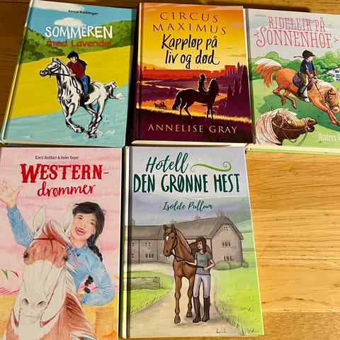 Bokpakke med fem hestebøker fra Stallgjengen og Sunny-seriene. Inneholder bøkene: Den uønskede hesten av Pamela Cockerill, På flukt av Peggie Cannam, Hest i storbyen av Bonnie Bryant, Islandshesten av Susanne Kronenberg, og Hva nå, Tipsy? av Gisela Kautz. Bøkene har fargerike omslag med illustrasjoner av hester og mennesker, og passer for lesere som er interessert i hestehistorier.