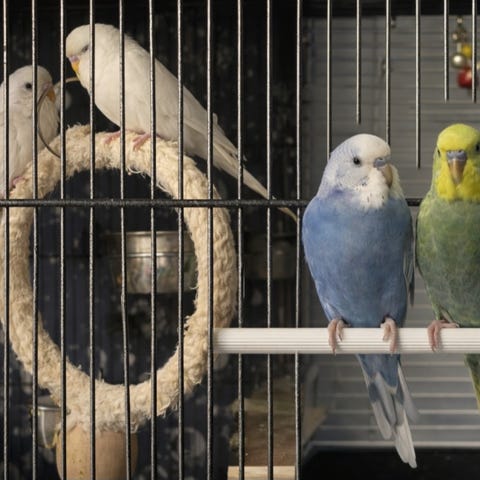 To undulater, en gutt og en jente selges med bur.