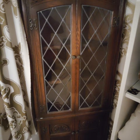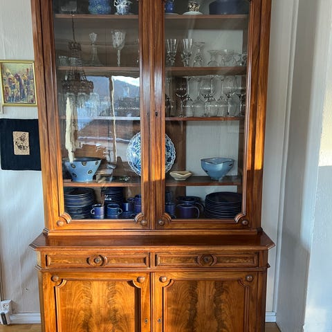 Vitrineskap i mørkt tre med tre glassdører øverst og tre skapdører nederst. Skapet har dekorative detaljer og låsbar midtdør. Egnet for oppbevaring og utstilling av gjenstander.