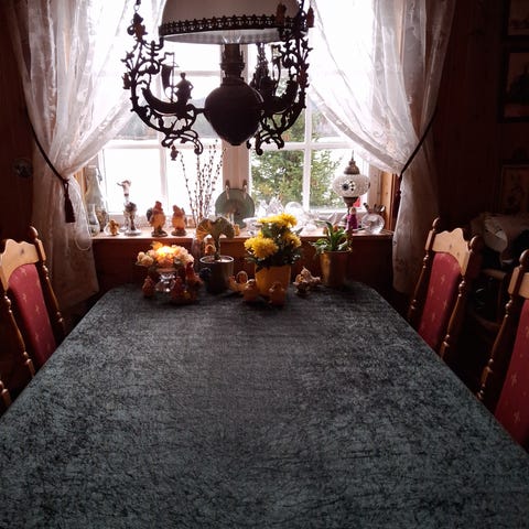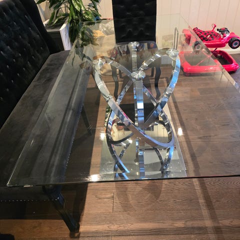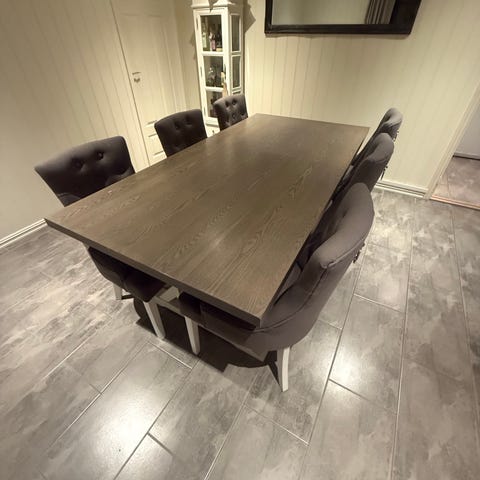 Pent brukt spisegruppe med 8 stoler og framskap selges. Må hentes snarest.
