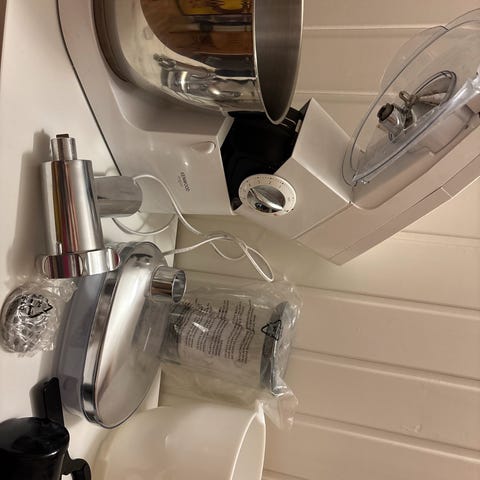 Kenwood Major kjøkkenmaskin med flere tilbehør inkludert visp, deigkrok og rustfri stålbolle. Kjøttkvern og ekstra bolle følger også med. Maskinen har justerbar hastighet og er designet for effektiv matlaging og baking.