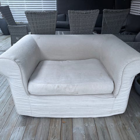 Den har to flekker, en på venstre kant oppe, og en midt på fremme på setet. Dette er flekker som kom når stolen ble renset fordi alt vannet ikke ble trekt ut. Går nok bort med ny runde rens. Vært lite brukt, men utrolig pen å se på og god å sitte i.