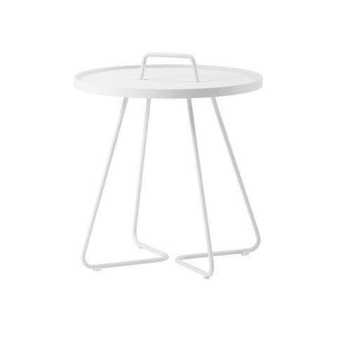 Lite bord i hvit plast. Firkantet form med rette ben. Egnet for innendørs og utendørs bruk.