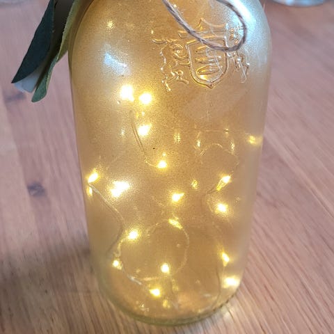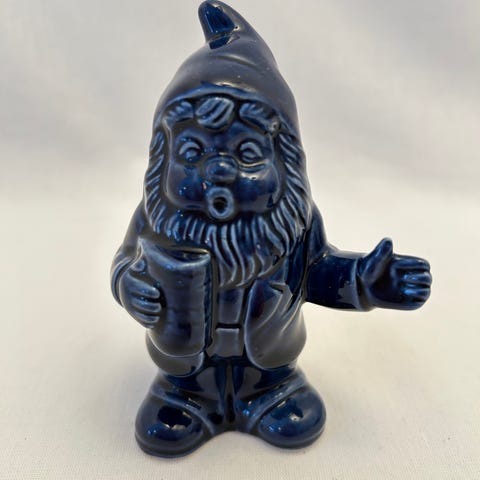 Nissefigur laget av keramikk. Figuren har en rød lue, blå jakke, røde bukser og holder en liten lykt. Egnet som dekorasjon, særlig i julen.