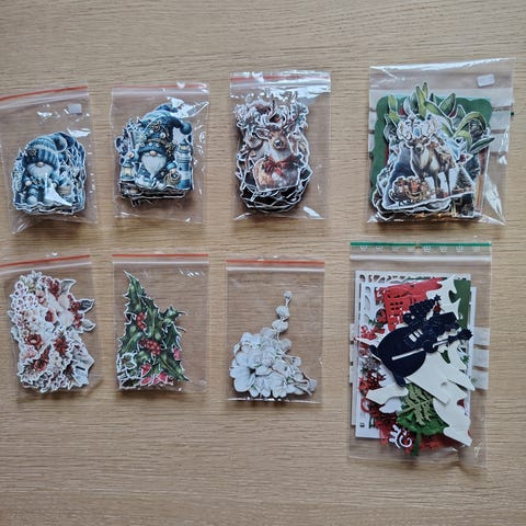 Die cuts selges samlet. Her er litt av hvert. Figurer som Ole Brum, Tigergutt, julemus, nisser, sirkler, firkanter, blomster, bjeller o.l.