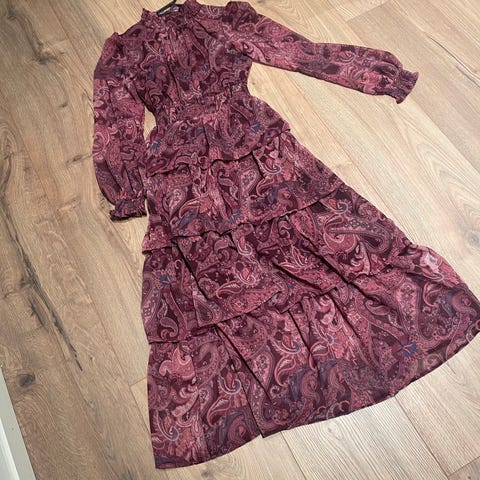 Kjole til spesiell anledning i blå stretch denim, størrelse S. Kjolen har en stroppeløs design med lagdelte volanger på skjørtet og glidelås bak. Materialet gir en elastisk passform.En superfin kjole som jeg har brukt i sommer. Kjøpte den før sommerferien og er pent brukt, har ingen bruktsmerker Perfekt jeanskjole nå til våren. Nypris: 280kr