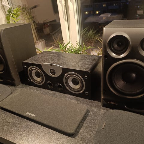 LG lydanlegg med subwoofer og flere høyttalere. Svart farge, designet for hjemmeunderholdning med flere tilkoblingsmuligheter på baksiden av enheten.