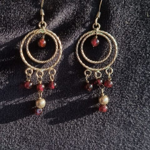 Granat halvedelstener smykkesett bestående av halskjede og øredobber. Smykkene har dyp rød farge og er laget av halvedelstener.