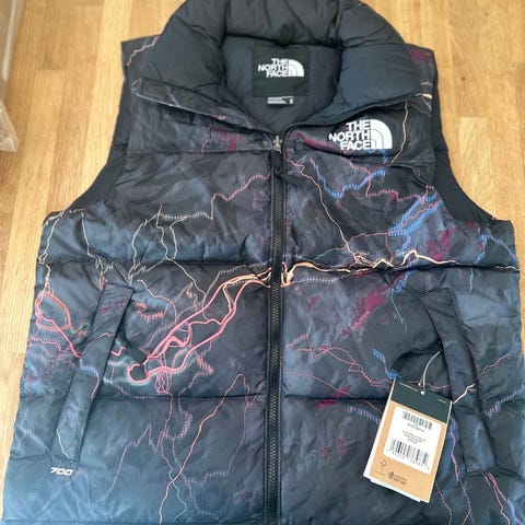 The North Face dunvest for herre i størrelse S. Vesten har flerfarget kamuflasjemønster. Egnet for utendørsbruk.