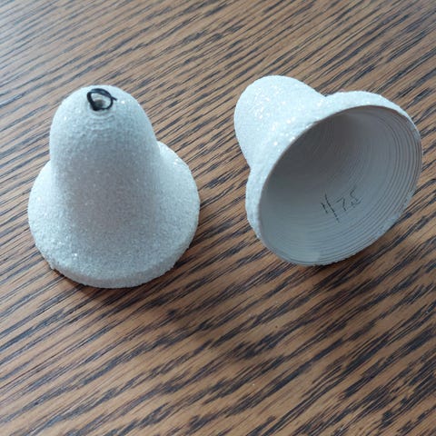 To flotte vintage juleklokker i isopor, trukket med et tett lag av små perler i hvitt, rødt og gull.
