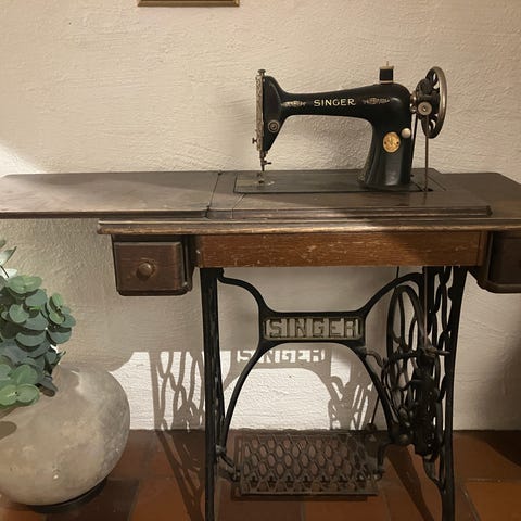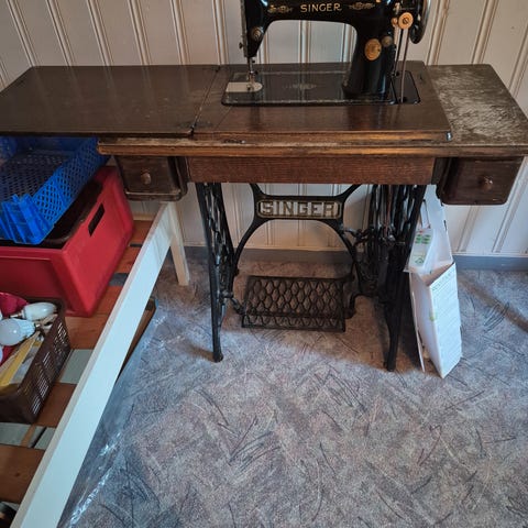 Vurderes solgt. Singer symaskin med tilhørende bord i tre og metall. Symaskinen har dekorative detaljer og er montert på et bord med et metallstativ. Bordet har en klaff som kan foldes ut for ekstra arbeidsflate. Passer til håndsøm og mekanisk søm.