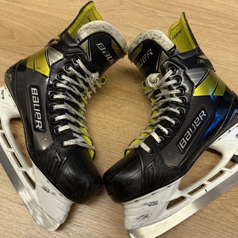 Bauer ishockeyskøyter i størrelse US 8.5 / EUR 42. Skøytene har svart og hvit farge med snøring og er laget for ishockey.