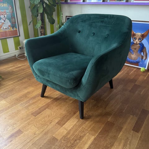 Koselig lenestol selges. Kjøpt på jysk for noen år siden for 2000kr. Brukt mest som prydmøbel, så langt i fra i daglig bruk. I god stand - man ser kun at den er litt flatere i stoffet på sitteputen.