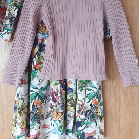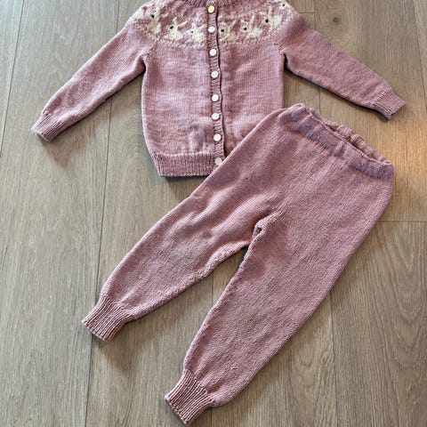Selger en hjemmestrikket genser og bukse. Er mottatt som gave, så vet dessverre ikke hvilket ullgarn det er strikket i. Det grå garnet i buksen og mønsteret på genseren er litt grovere og mer slitesterkt enn det turkise i genseren. Genseren er kun prøvd på og har ingen anmerkninger, buksen er brukt under dress 2 ganger og har ingen flekker, men antydning til nupper. Ellers ingen anmerkninger som jeg har sett. Settet passet da min sønn var ca 2 år gammel, men siden hjemmestrikkede klær kan variere i størrelse har jeg også tatt mål.