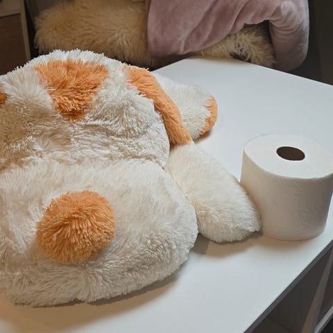 Rosa hundebamse fra kid fylt med korn eller sacco-fyll.