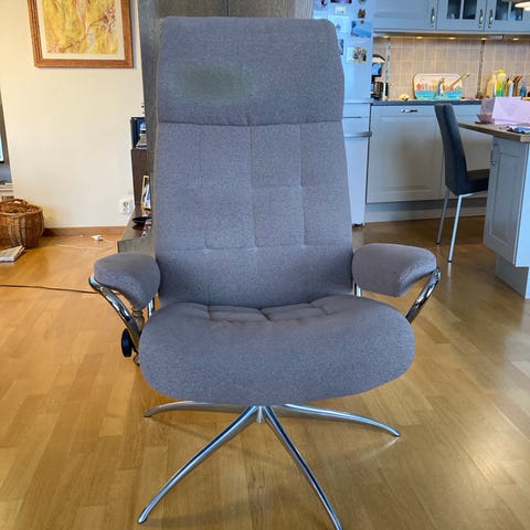 Stressless lenestol med krakk fra Ekornes i farge lys beige/cream. Retro modell som ikke lenger selges. Høy rygg med armlener og mulighet for 360° sving. Farge på krakk matcher med farge på stol da de er i samme sett. Pent brukt og har ikke vært i kontakt med dyr/pels. Ta gjerne kontakt for mer informasjon!