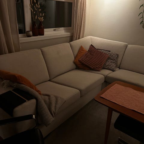 Hjørnesofa gis bort. Ca 12 år gammel, noen små hull i noen puter. Hull i rygg etter at hunden gravde litt, ikke synlig når putene er i. Har blitt støvsugd men det kan fortsatt være hundehår å finne. Putene oppbevares for tiden inne i huset, resten står i garasje.