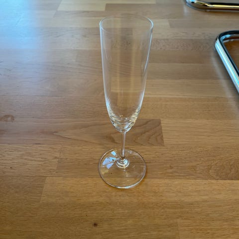 Riedel vinglass. Ut fra hva jeg har klart å finne ut, mener jeg dette skal være av typen Vinum Montrachet/ Chardonnay. Drøye 19 cm høyt, med åpning på rundt 82-84 mm.